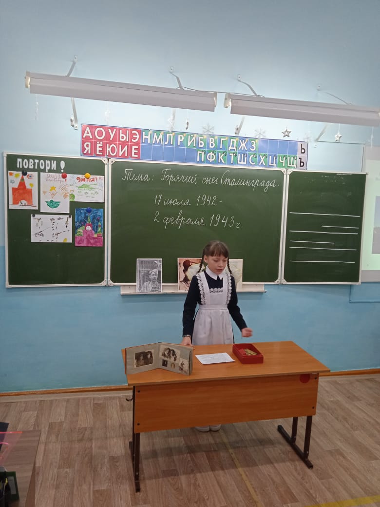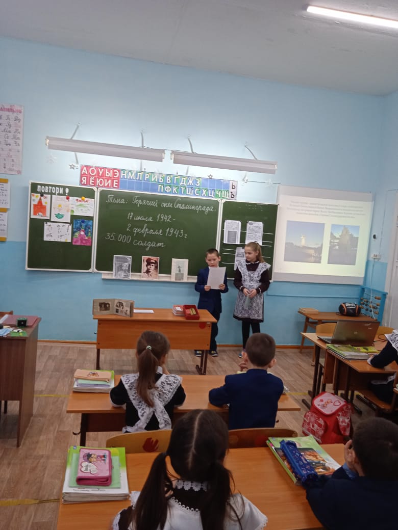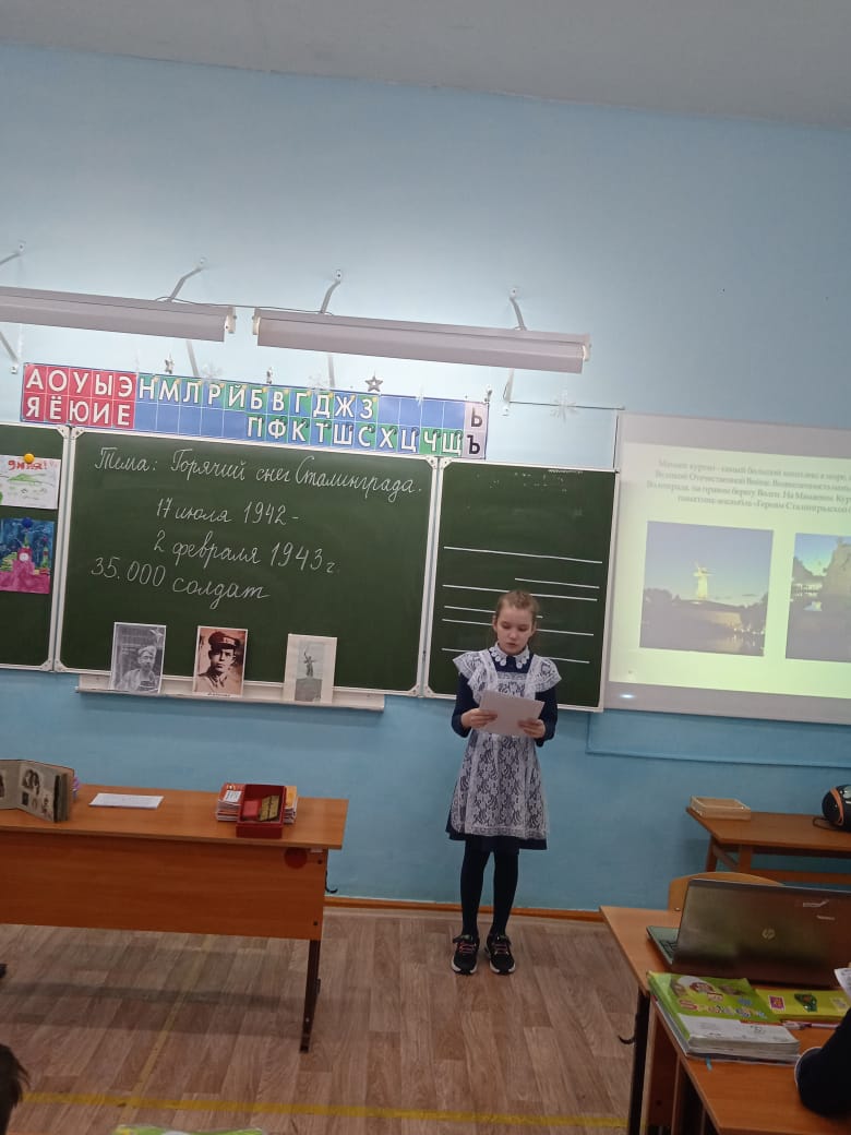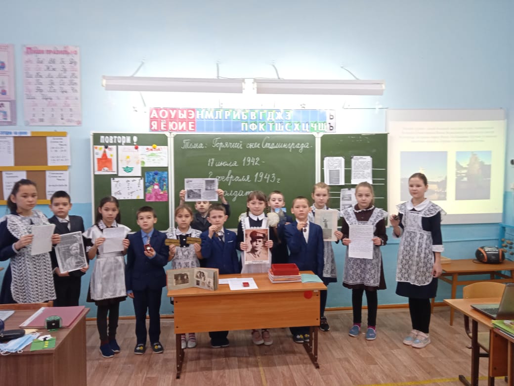 Неизгладимое впечатление оставил в памяти ребят Урок мужества «Горячий снег Сталинграда», который провела Маннапова Р.В. На уроке третьеклассники узнали о том, какой ценой досталась победа советской армии, сколько испытаний выпало на долю жителей и защитников города Сталинграда. Надолго запомнится ребятам рассказ Ибрагимовой Миланы о прадедушке Асадуллине Фарите Хуснутдиновиче, участнике Сталинградской битвы. Ребята узнали о его фронтовой жизни через фотографии, личные вещи и награды. Сираев Данил поделился своими впечатлениями от посещения Мамаева Кургана, где восемь десятилетий назад проливалась кровь, совершались бесстрашные подвиги, отвоёвывалась земля пядь за пядью. Стоя прямо у подножия знаменитого монумента Родина-мать, Данил наблюдал город Волгоград, жизнь которого отстояли доблестные советские солдаты.